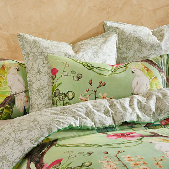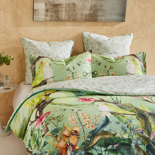 أوراق الشجر الجميلة والزهور الاستوائية الغنية من الكركديه والأوركيد البرية، تؤطر الألوان المائية ذات الخلفية الخضراء الناعمة. خلق ملاذ مثالي للببغاوات والكوكاتو للتسكع. الطباعة العكسية المتباينة مصنوعة من فن خطي يصور الكركديه وبساتين الفاكهة.