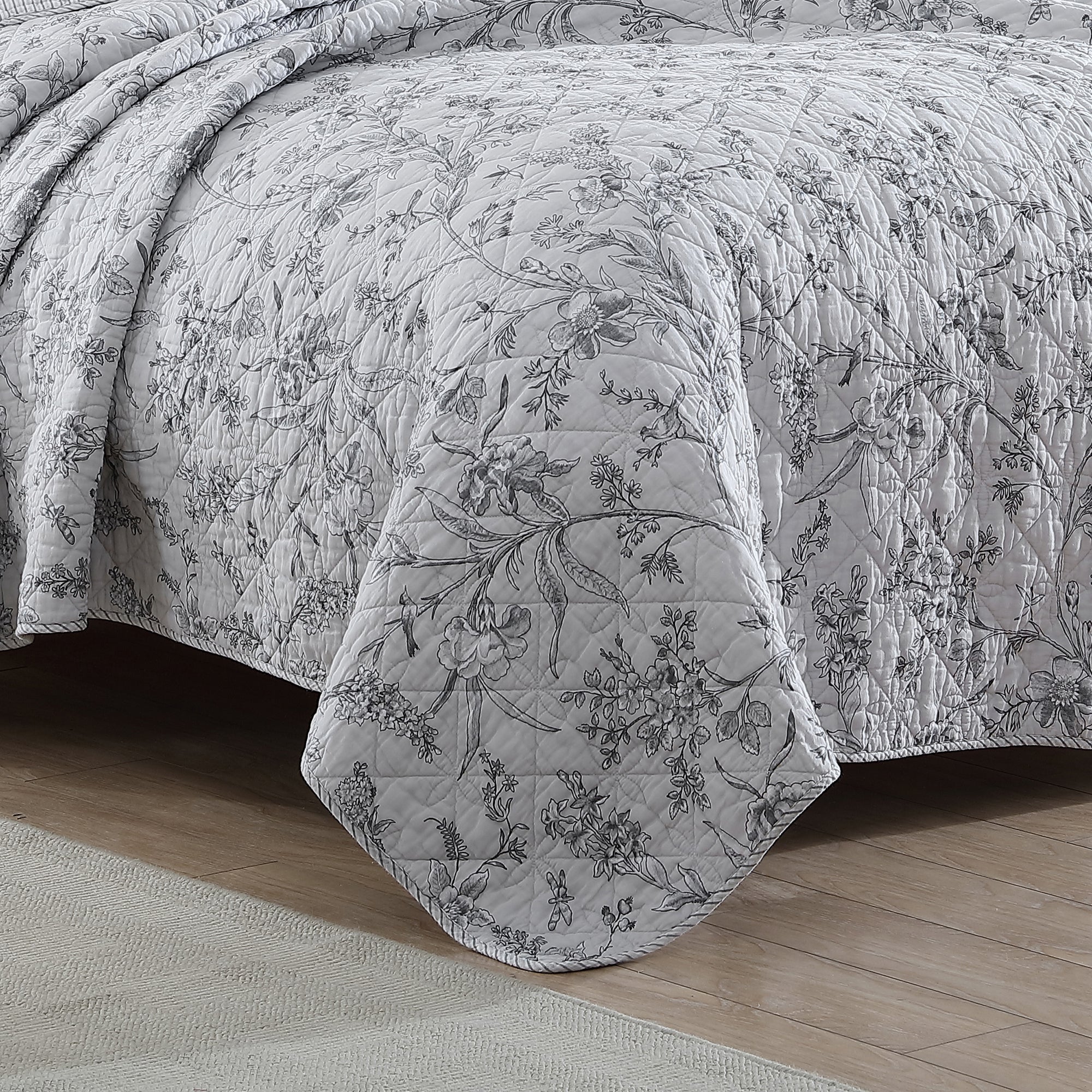 تتميز مجموعة أغطية أغطية الحمامات من Laura Ashley بتصميم زهور رمادية على أرضية بيضاء ناعمة يمكن عكسها بالكامل إلى تصميم مخطط رقيق، مثالية لخلق إطلالات متعددة لغرفة النوم.