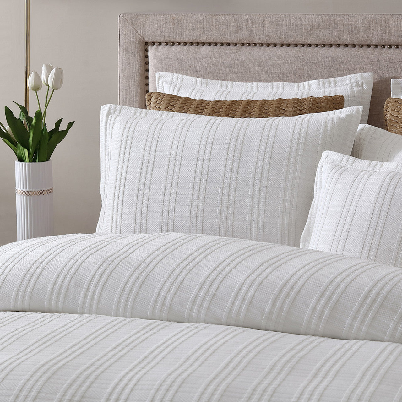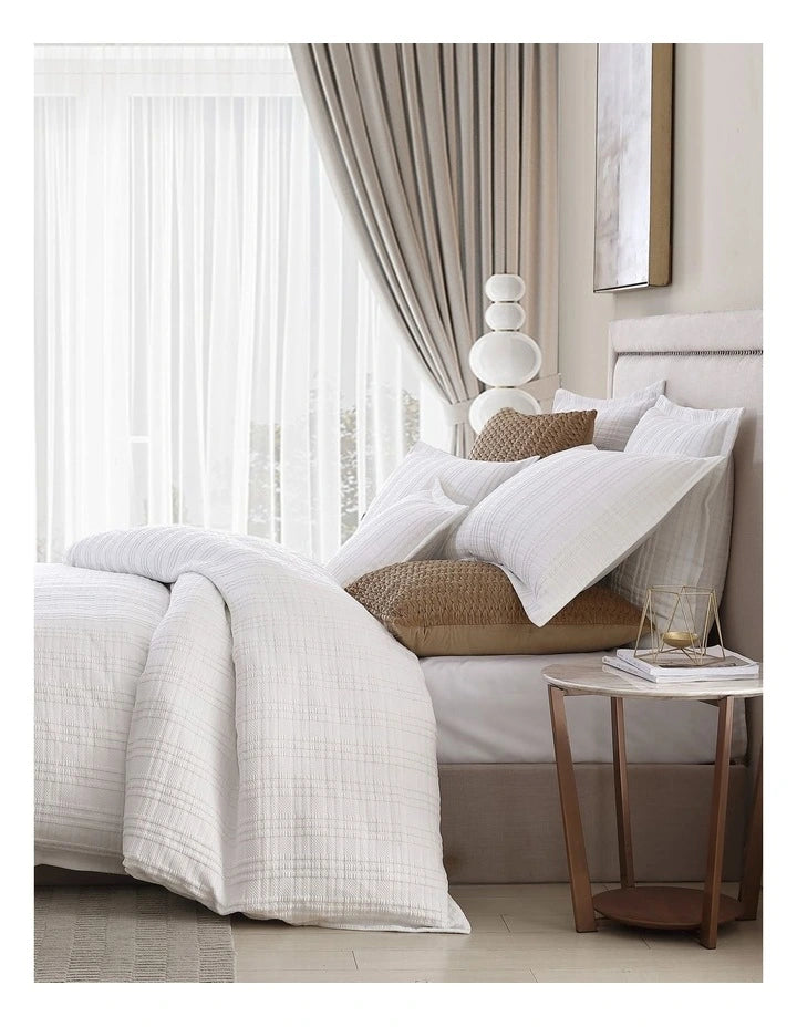 استمتع بالرقي الخالد مع مجموعة غطاء لحاف السرير الأبيض وينتون من المجموعة الخاصة. تعرض هذه المجموعة الرائعة تصميم جاكار هندسي آسر ينضح بالأناقة. تم تزيين مجموعة Winton بذوق رفيع بحافة ذات حدود ذاتية، مما يضيف لمسة من الرقي ويخلق مظهرًا مخصصًا ملفتًا للنظر. للحصول على جمالية متناغمة حقًا، استكمل المجموعة بأغطية وسائد أوروبية متطابقة.