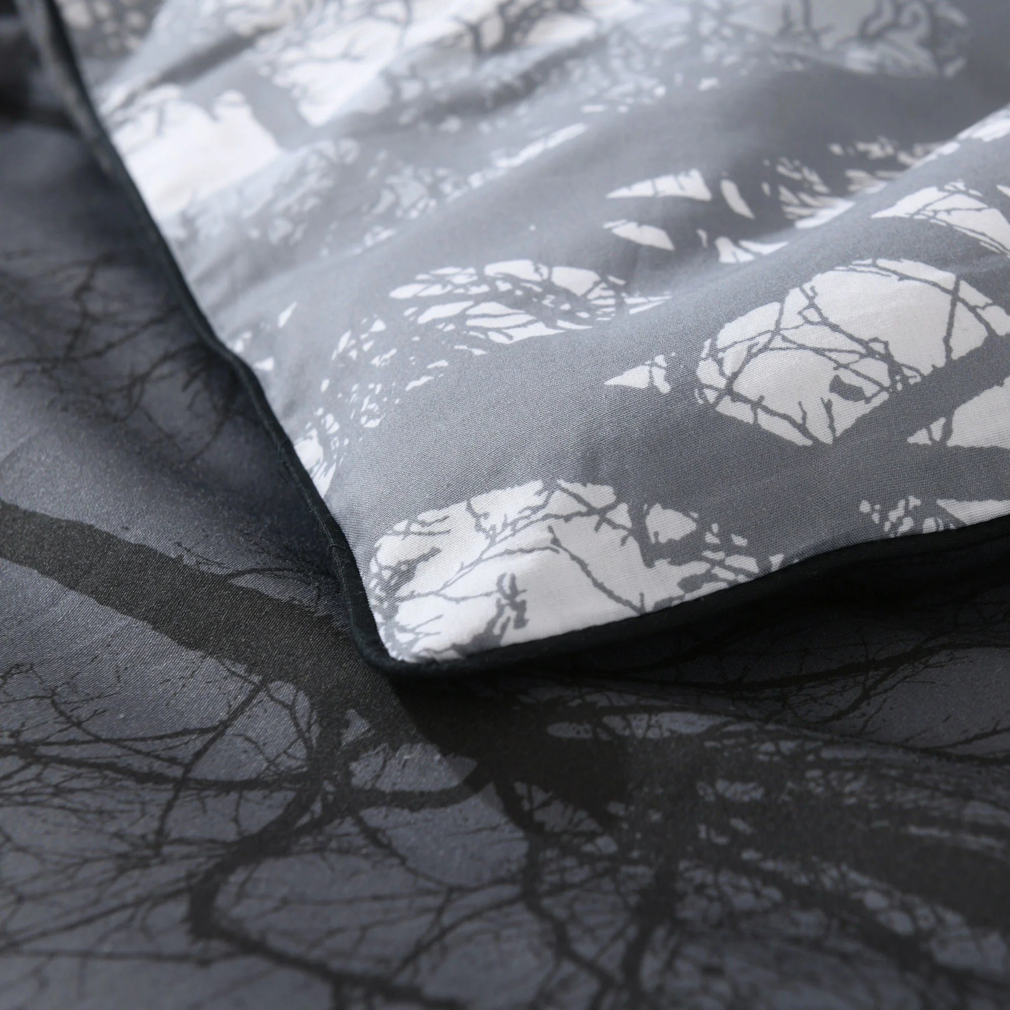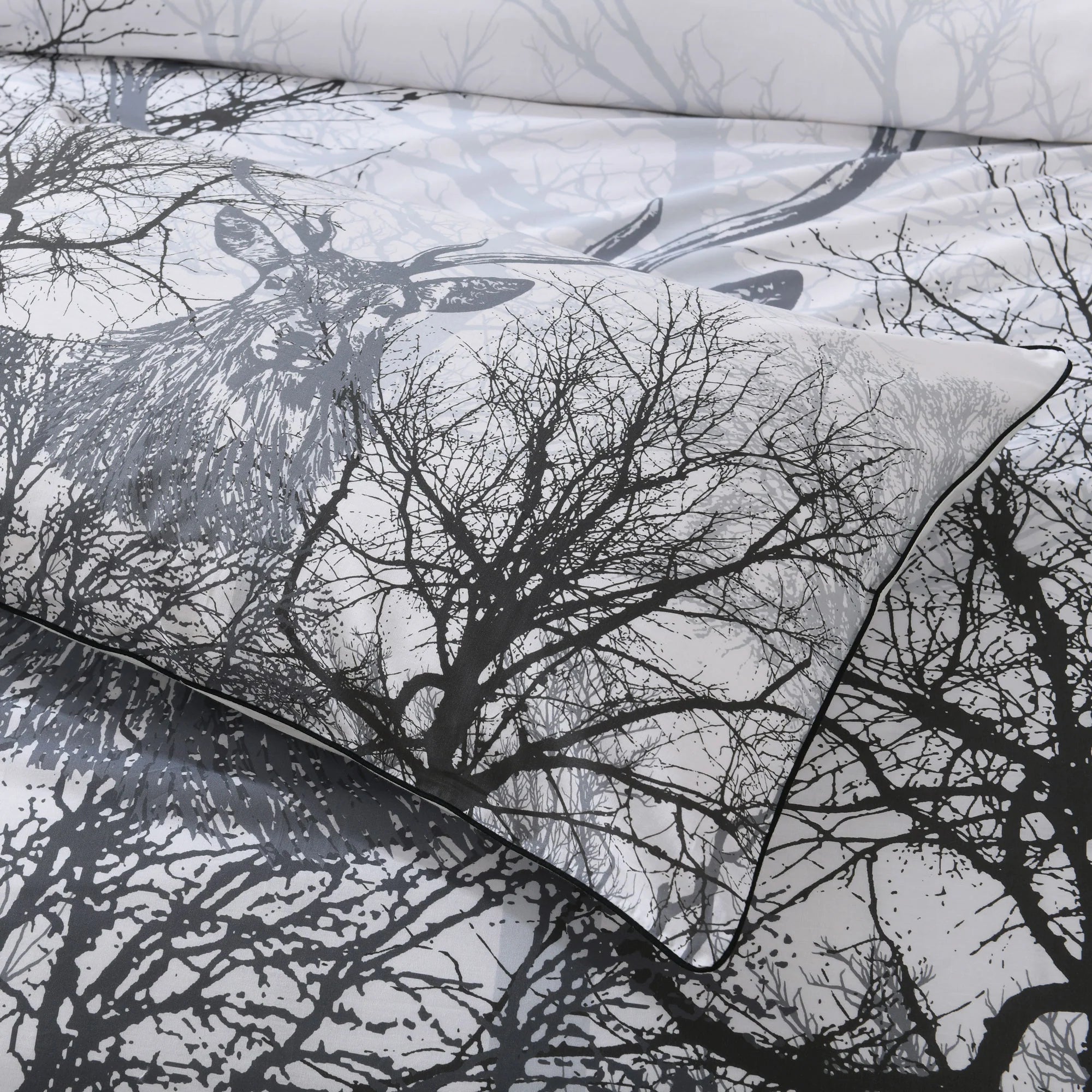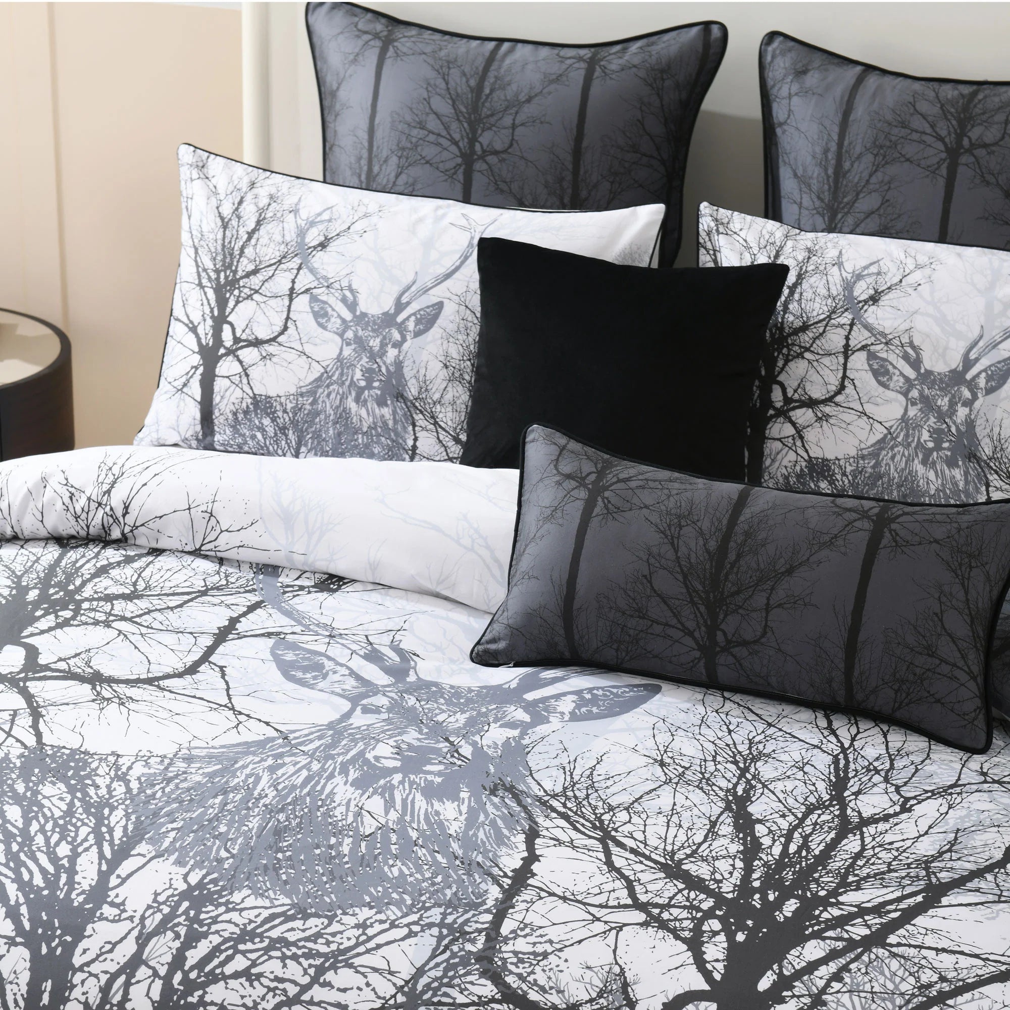 أعد الغابة إلى منزلك بهذا التصميم العصري. يتميز التصميم برأس أيل مذهل يخرج من خلف الأشجار الطويلة مما يخلق قطعة مميزة لغرفة نومك. تمت طباعته على قماش يسهل العناية به ويتميز بخطوط عكسية متناسقة وسوداء.