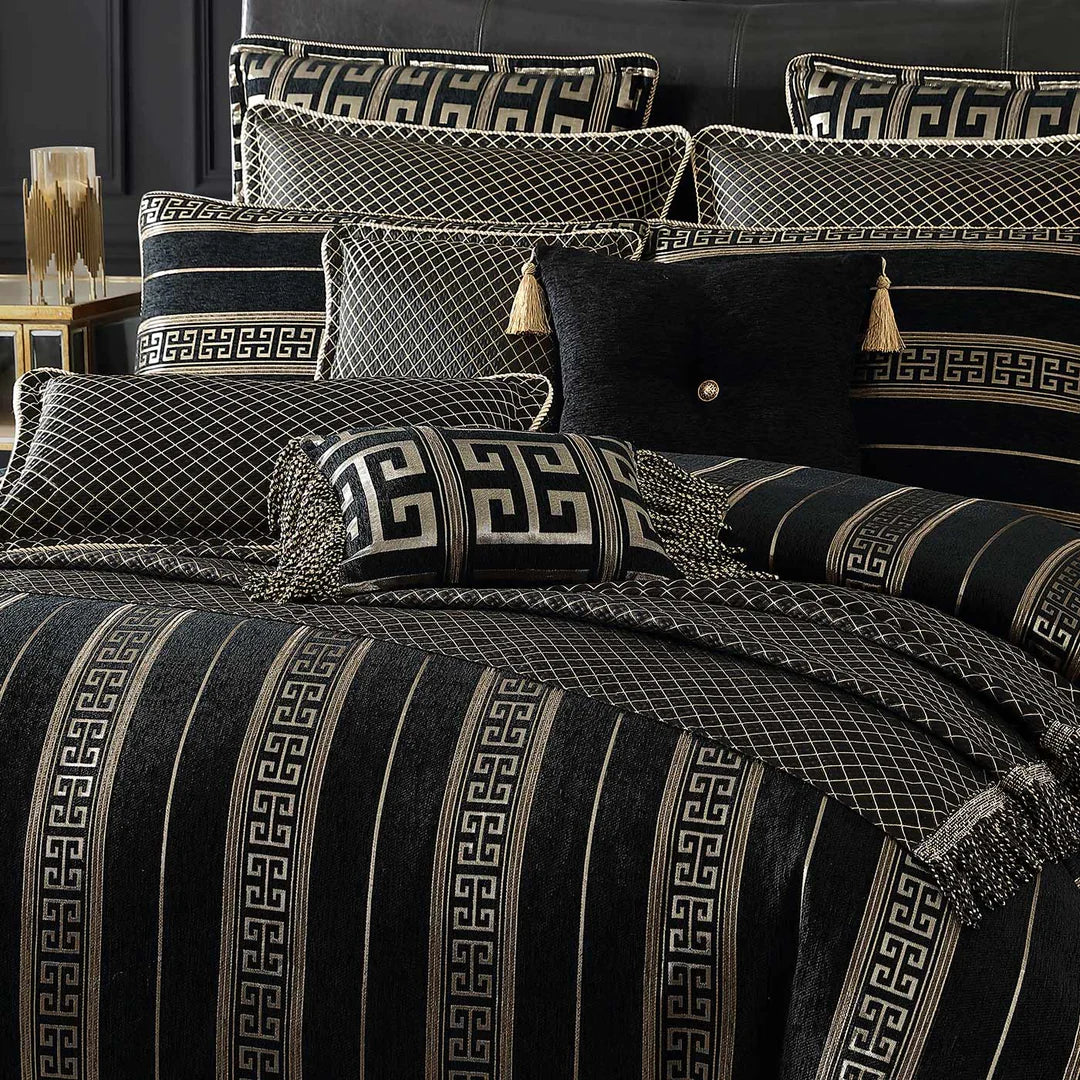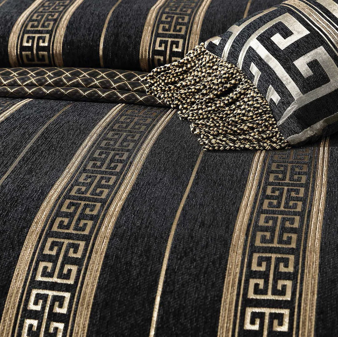 أضف لمسة من الدراما إلى غرفة نومك مع طقم غطاء لحاف السرير الذهبي من دافينشي ماتيو. يجذب هذا الطقم الرائع الانتباه بخطوطه الجريئة باللونين الأسود والذهبي، والمنسوجة بمهارة في قماش شانيل ناعم الملمس. تم رفع التصميم الفاخر بشكل أكبر مع إضافة شكل مفتاح يوناني ذهبي معدني، مما يضفي بريقًا مشعًا. لتعزيز الأجواء الفاخرة، استكمل المجموعة بغطاء وسادة ماتيو الأوروبي ووسادة الغداء. كلاهما مزين بظهر من الشانيل الأسود، ويوفران خيارات تصميم متعددة للحصول على مظهر شخصي ومتطور حقًا.