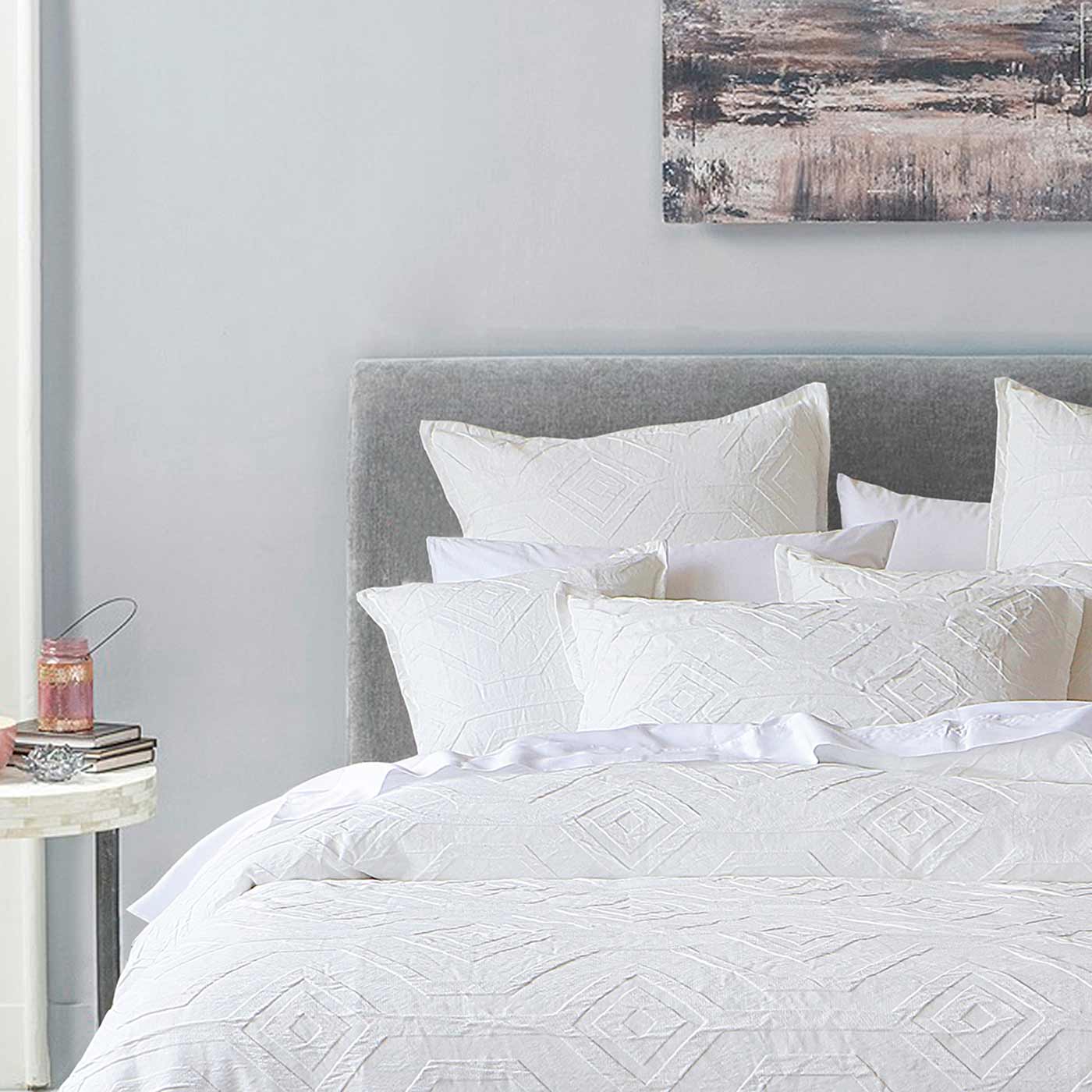 قم بتزيين غرفة نومك مع Kora. قماش جاكار سهل العناية بتصميم ماسي بارز. غطاء لحاف مصمم بشكل أنيق سيضيف لمسة من الأناقة إلى ملاذك. يتميز غطاء اللحاف وأغطية الوسائد والوسادة الأوروبية بحافة مصممة خصيصًا لإكمال المظهر الفاخر.