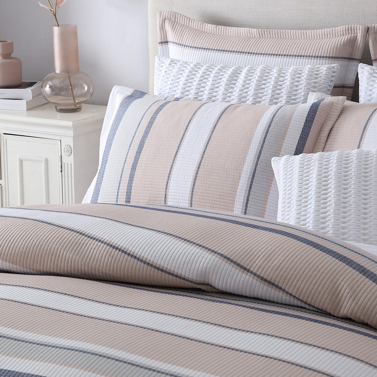 Experience a touch of laid-back sophistication with the Private Collection killarney dune bed quilt cover set. This exquisite set boasts relaxed stripes, perfect for capturing the essence of a stylish summer. The variegated stripes in serene shades of chambray, dune, and avocado effortlessly blend together on the luxuriously soft matelassé fabric.