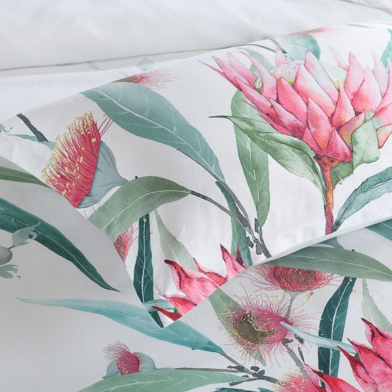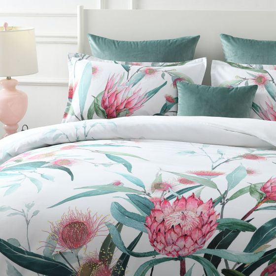 تتناقض الوارات الوردية المبهجة والمزدهرة بشكل جميل مع درجات الألوان الخضراء المحايدة للأوراق والتي تنتشر عبر غطاء اللحاف بالكامل. لوحة مطبوعة على قماش الساتان القطني الناعم، ستضفي أستراليا إشراقة على مساحتك. أكمل المظهر مع إكسسواراتنا المخملية الفاخرة باللون المريمية.