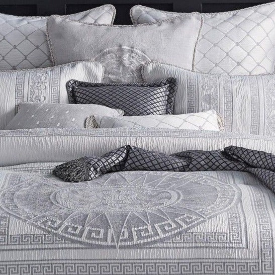 مجموعة لحاف ماسيمو الفضية الفاخرة بطبيعتها وملمسها الفاخر، تضفي لمسة من الأناقة على غرفة نومك. لوحة فاخرة من اللونين الأبيض والفضي تتناغم مع الشانيل الناعم وحدود المفاتيح اليونانية المزخرفة وزخارف الأسد المهيبة لإضفاء مظهر مذهل على جناحك الرئيسي. استكمله بالوسائد المنسقة والأغطية النسيجية لرفع مستوى المظهر الإمبراطوري أو مزج ومطابقة خيارات التصميم.