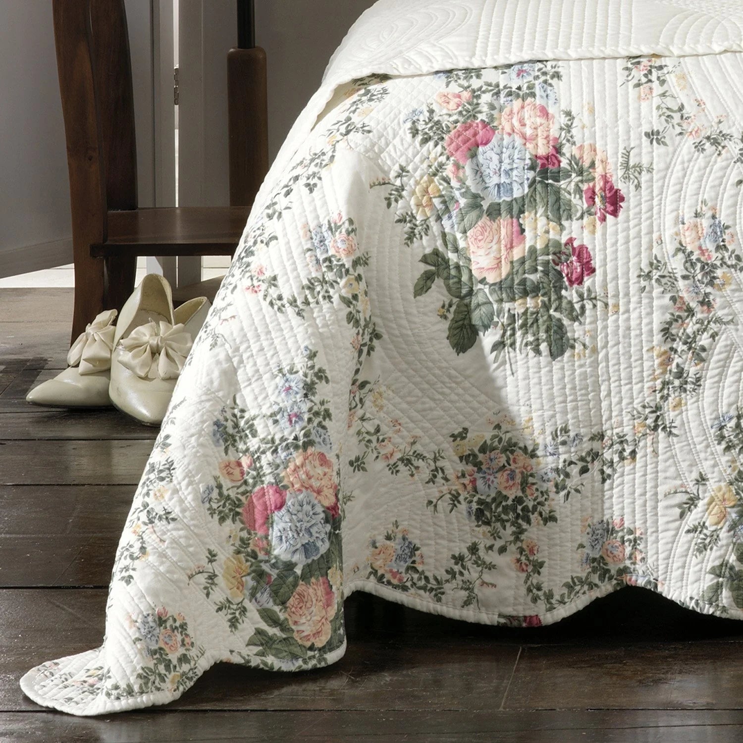 Introduce an air of timeless heritage into your bedroom with our stunning scalloped edge bedspread. Crafted with meticulous attention to detail, this exquisite piece features a classic white background that serves as a canvas for a breath taking array of flowers.