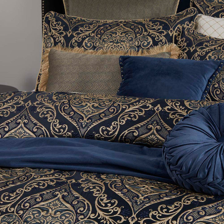 استمتع بجاذبية وعظمة تصميم الروكوكو الفرنسي مع مجموعة غطاء لحاف السرير الليلي من دافينشي بيرون. هذه المجموعة الرائعة تحيي انحطاط ودراما العصر. يعرض التركيب الرسمي والمتناسق زخارف زخرفية كبيرة غنية بخيوط ذهبية معدنية، موضوعة على أرضية بحرية عميقة. يضيف النسيج الماسي الفاخر المتباين على الأكسسوارات ذات الحواف الذهبية تداخلاً أنيقًا بين الأنماط، مما يزيد من فخامة المجموعة. انغمس في فخامة طقم غطاء لحاف السرير الليلي دافينشي بيرون وحوّل غرفة نومك إلى مساحة من الجمال الرائع.