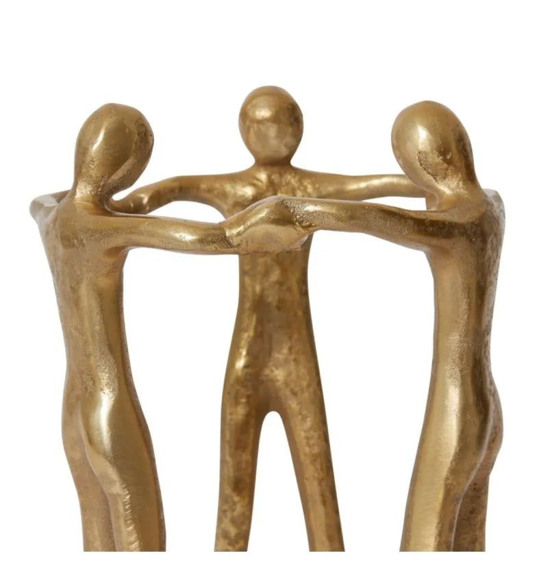 Our Friendship Sculpture Gold adds a truly special touch to any living space. Carefully crafted with high-quality gold aluminum, this unique design features three figures standing tall, their hands intertwined to create a perfect circle. Add sophistication and interest to your home with this captivating piece.