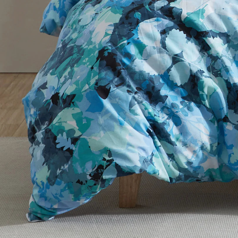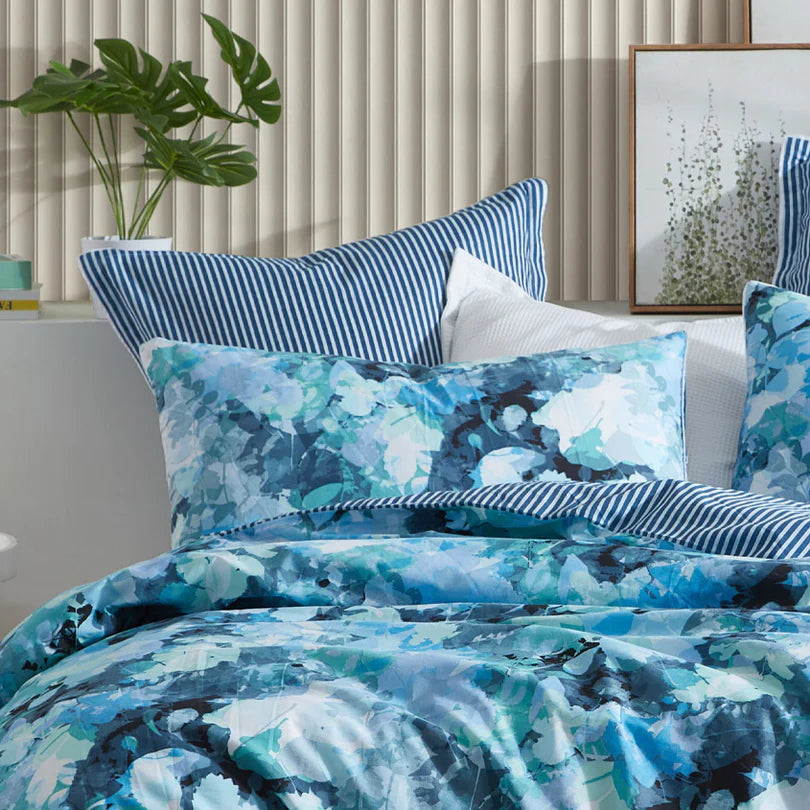 Embrace the modern allure of the Heather Quilt Cover Set Range Blue by Logan and Mason, where layers of foliage in various shades of blue come together to form this captivating design. The reverse side features a printed ticking style stripe in navy and sky, introducing a smart and casual element to the overall mix. The addition of white piping provides a crisp finish, enhancing the sophistication of the set. Immerse yourself in the contemporary elegance of the Heather Blue range, creating a stylish and serene ambiance in your bedroom.