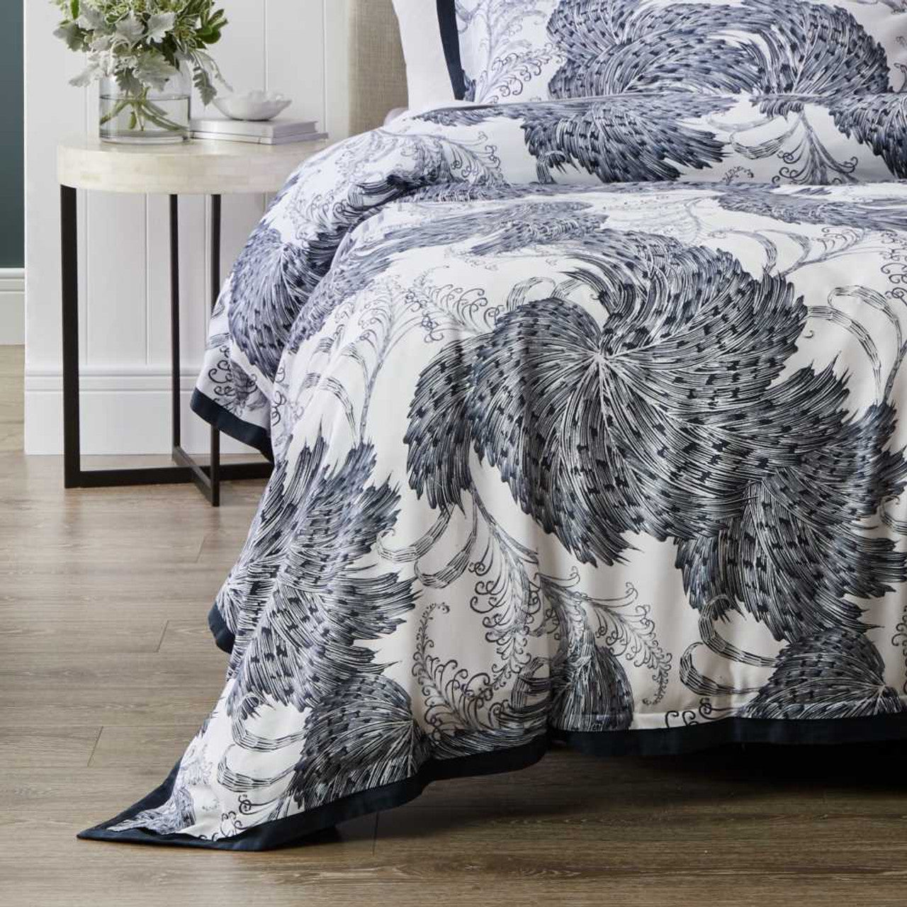 Step into a world of luxurious resort-style living with the Sago Ink Bed Quilt Cover Set from Private Collection. This exquisite set offers a monochromatic escape, immersing you in an atmosphere of opulence. The design showcases oversized hand-drawn elements in striking navy and crisp white, creating a bold and captivating visual statement.