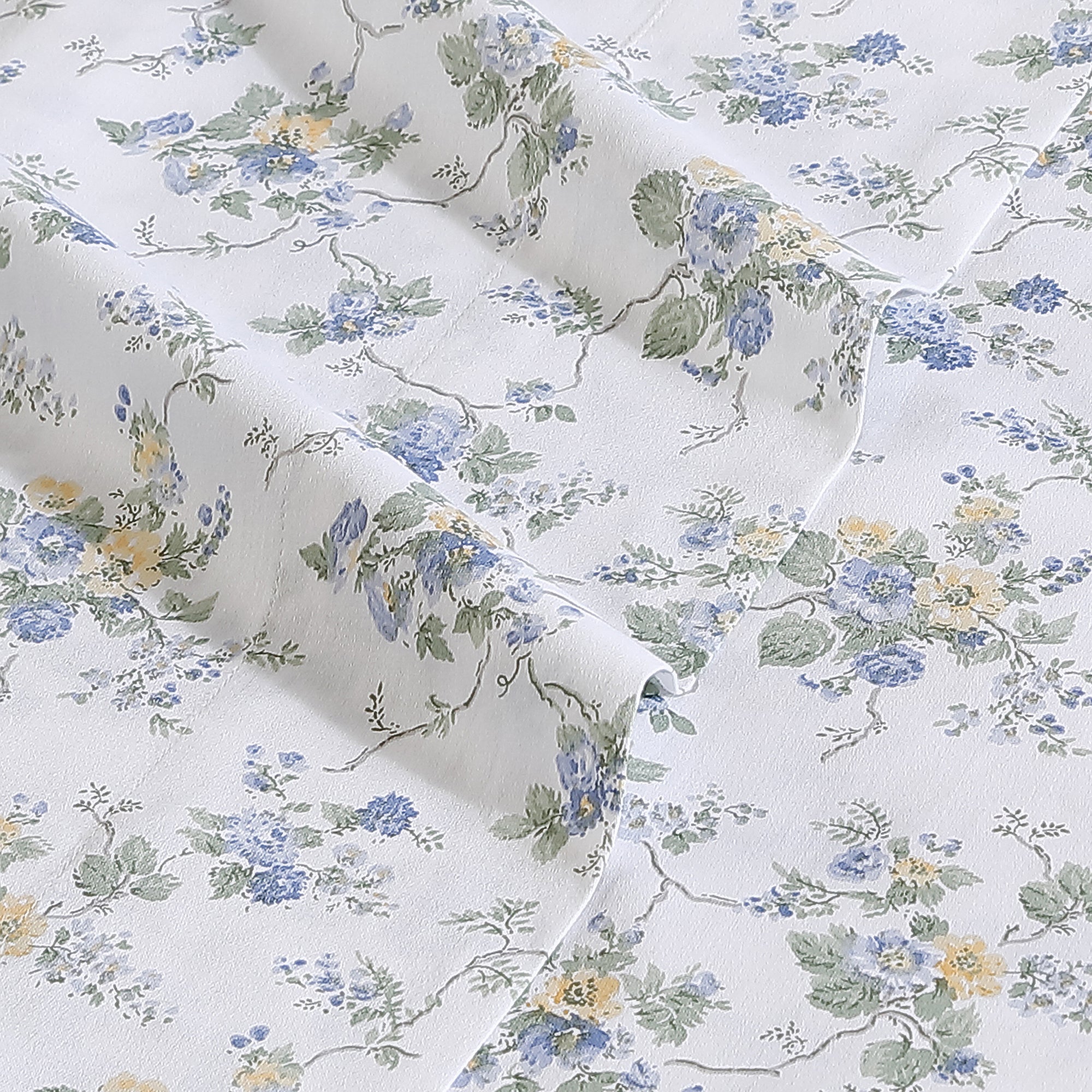 The Le Fleur 375THC Cotton Sheet Set by Laura Ashley offers a luxurious look for your bedroom. Crafted with 100% cotton sateen and a 375 thread count, you can enjoy the softness of its petite floral print in a fresh palette of blue and yellow on white ground with sage accents. Add a contemporary floral vibe to your interior with this stylish sheet set.